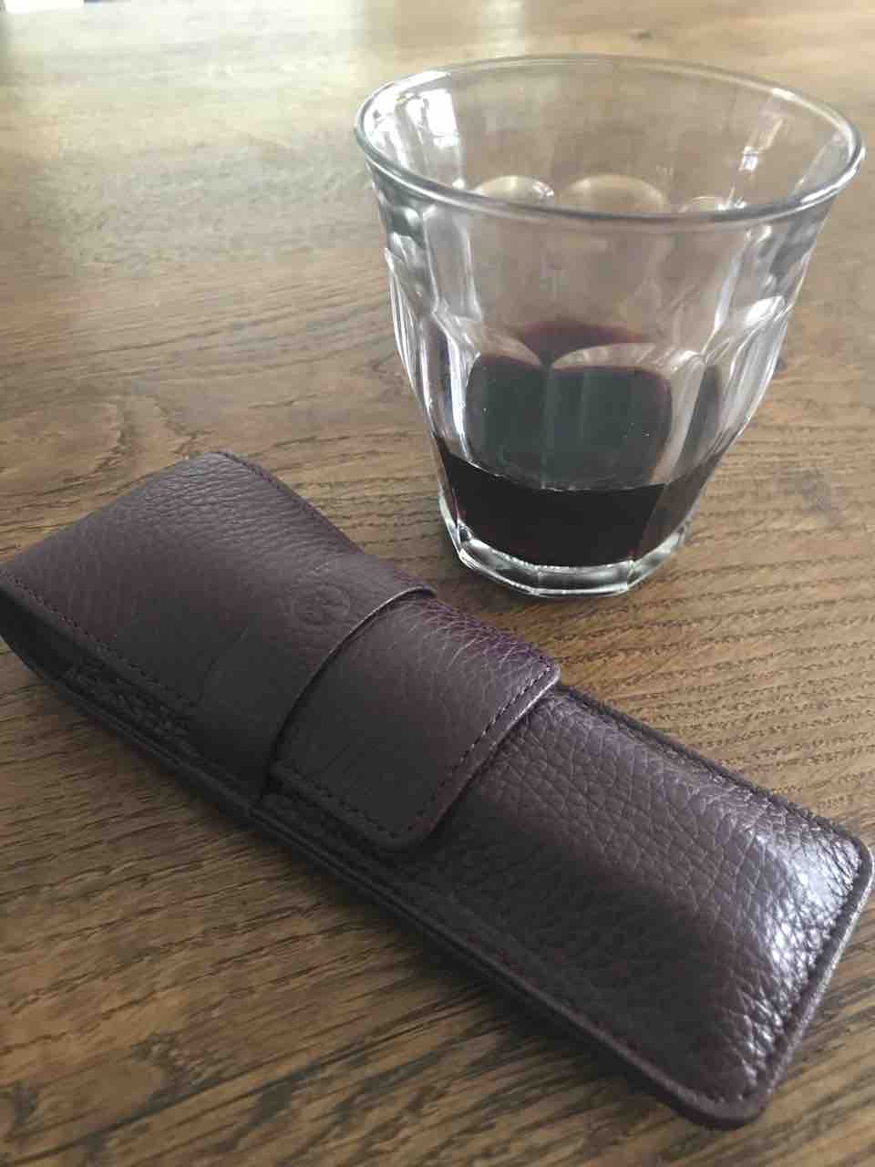 表が柔らかくなめした牛革で、内側はピッグスエード製でこちらも柔らかい。取り扱いが楽で、長く使っていると独特のツヤと風合いが出て来て、見た目&触感はかなり良く味わい深い。おまけにこれ見よがしのブランド表記のない所も気に入ってる。なので、気付けばこの5〜7本挿しタイプを茶、黒で何個か所有し机上に散らばる常用の筆記具をこれに仕舞い込み机に置く事が多かった。もちろん中長期の出張時は必ず持参していた。